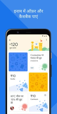 Google Pay आपको अपने डेबिट और क्रेडिट कार्ड को सुरक्षित रूप से लिंक करने का विकल्प देता है, जिससे आप ऑनलाइन खरीदारी और NFC सक्षम टर्मिनलों पर टैप-टू-पे जैसी सुविधा का लाभ उठा सकते हैं। अब आप MMTC-PAMP के साथ 24 कैरट सोना खरीद और बेच सकते हैं, जिसे आपके Google Pay गोल्ड लॉकर में सुरक्षित रखा जाता है, या सिक्कों के रूप में आपके घर डिलीवर भी किया जा सकता है – यहाँ तक कि इनाम के तौर पर भी सोना जीत सकते हैं! अपने बैंक खाते की शेष राशि कभी भी, कहीं भी तुरंत देखें और बैंक या ATM जाने की आवश्यकता को समाप्त करें। दोस्तों को रेफ़र करके और प्रत्येक भुगतान पर रोमांचक ऑफ़र और इनाम प्राप्त करके अपनी डिजिटल यात्रा को और भी फायदेमंद बनाएं। Google Pay Aditya Birla Finance Limited, Axis Bank, Bajaj Finance Limited, DMI Finance जैसे प्रमुख ऋणदाताओं के साथ साझेदारी में ऋण सुविधाएँ भी प्रदान करता है, जिससे आपकी वित्तीय ज़रूरतों को पूरा करना और भी आसान हो जाता है।