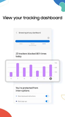 आपकी ऑनलाइन गोपनीयता हमारी सर्वोच्च प्राथमिकता है। सैमसंग इंटरनेट में 'स्मार्ट एंटी-ट्रैकिंग' सुविधा डिफ़ॉल्ट रूप से सक्रिय है, जो वेबसाइटों को आपकी अनुमति के बिना आपकी ऑनलाइन गतिविधियों को ट्रैक करने से बुद्धिमानी से रोकती है। 'क्विक एक्सेस' पेज पर उपलब्ध 'प्राइवेसी रिपोर्ट' आपको यह जानने का एक आसान तरीका प्रदान करती है कि विज्ञापन और ट्रैकिंग कितनी सफलतापूर्वक ब्लॉक की जा रही है, जिससे आपको अपनी सुरक्षा की स्थिति का स्पष्ट अवलोकन मिलता है। इसके अतिरिक्त, 'प्रोटेक्टेड ब्राउज़िंग' सुविधा आपको दुर्भावनापूर्ण साइटों से पहले ही चेतावनी देती है, जबकि 'कंटेंट ब्लॉकर्स' अवांछित विज्ञापनों और सामग्री को फ़िल्टर करके आपके ब्राउज़िंग अनुभव को और भी सुरक्षित और अधिक केंद्रित बनाते हैं।