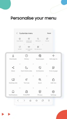 सैमसंग इंटरनेट आपके उपयोग को आसान और अधिक व्यक्तिगत बनाने के लिए डिज़ाइन किया गया है। अब आप टैब समूहों और बुकमार्क्स को 'ड्रैग एंड ड्रॉप' करके आसानी से व्यवस्थित कर सकते हैं, जिससे आपके पसंदीदा पृष्ठों तक पहुंच और भी सुविधाजनक हो जाती है। टूल मेनू (≡) में किसी भी बटन को देर तक दबाकर 'कस्टमाइज़ मेनू' तक सीधी पहुंच के साथ, आप अपनी आवश्यकताओं के अनुसार इंटरफ़ेस को अनुकूलित कर सकते हैं, जिससे महत्वपूर्ण कार्य हमेशा आपकी उंगलियों पर रहें। सैमसंग इंटरनेट इन सभी विशेषताओं के लिए आवश्यक अनुमतियों का अनुरोध करता है, लेकिन केवल तभी जब वे किसी विशेष कार्यक्षमता के लिए अनिवार्य हों, जिससे आपके डेटा और गोपनीयता का सम्मान बना रहे।