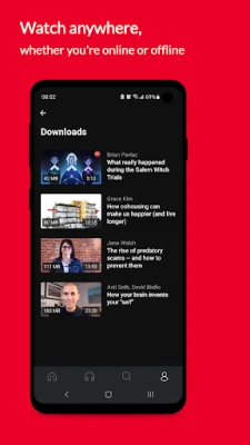 TED की विशाल वीडियो लाइब्रेरी में पूरी तरह से खो जाएँ, जहाँ आप अपनी पसंद की किसी भी टॉक को खोज सकते हैं और 100 से ज़्यादा भाषाओं में उपलब्ध सबटाइटल के साथ उसका आनंद ले सकते हैं। अपनी रुचि के अनुसार विषयों और मूड के हिसाब से ब्राउज़ करें। इसके अलावा, TED Audio Collective के सभी पॉडकास्ट एपिसोड सुनें, जिनमें एडम ग्रांट के साथ 'Work Life' और डॉ. जेन गुथेर के साथ 'Body Stuff' जैसे लोकप्रिय शो शामिल हैं। चलते-फिरते सीखने और प्रेरित होने के लिए, आप अपनी पसंदीदा Talks के वीडियो या ऑडियो को ऑफ़लाइन सुनने या देखने के लिए सहेज सकते हैं।